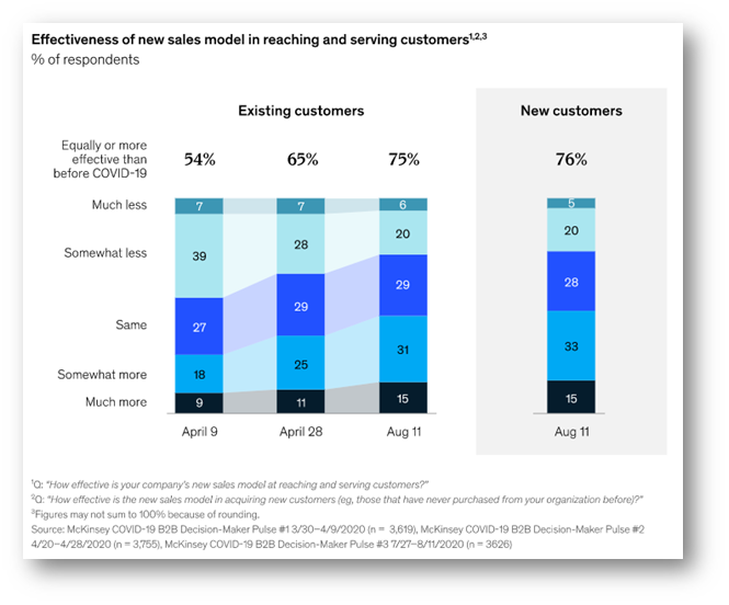Late last year, we posted a blog highlighting a McKinsey report that explored how COVID-19 has changed B2B sales forever. One of the most interesting charts in that article was the effectiveness of the virtual sales model in reaching and serving customers. Whereas in April 2020, 54% of businesses thought the new model was equal or more effective, by August the same year that number had jumped to 75%.