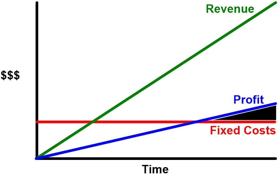 This chart is the profit model of a business. The green line is the Revenue line, the blue line is Gross Profit, and the red line is Fixed Costs. The section in black is Net Profit (ie. the actual money this business made).