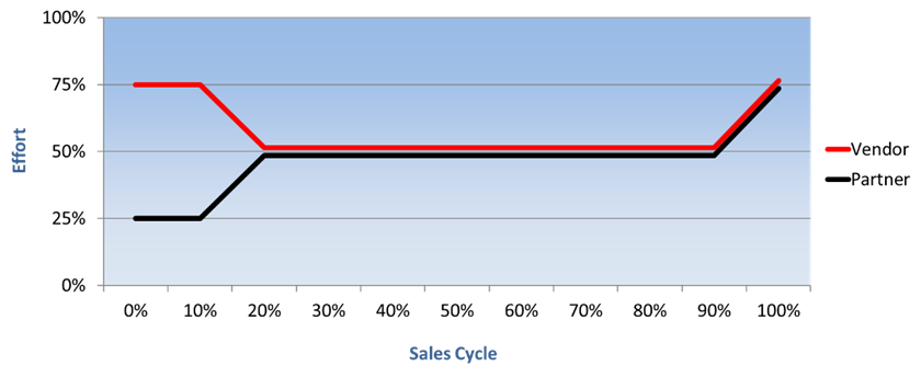 Who owns the customer? If both vendor and partner think they do, you’re not collaborating – you’re competing. I worked with a vendor who described their partner sales engagement model using the diagram below (ie. the vendor does the initial work to uncover the opportunity, then they work together on the deal, then they both push hard at the end to close it). It looks good, doesn’t it? Until you realise that they are both responsible for 75% of the effort at the end!