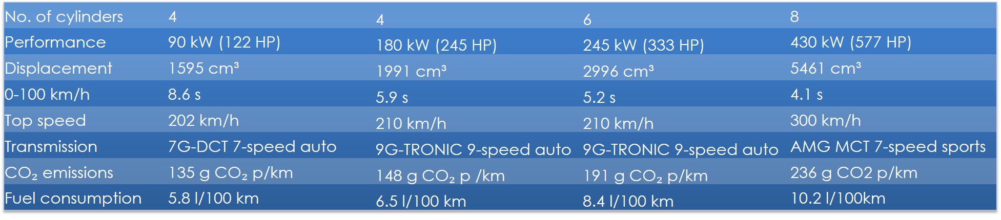 If I provide the following spec sheet, there will be a different group of people who don’t know the Mercedes range, but will understand the differences between the cars based on the technical specifications. And of course, there will be those who don’t.