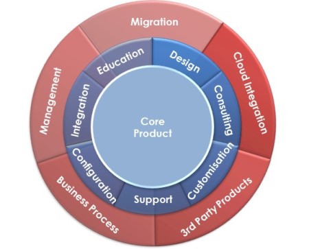However, the positive aspect is that the customer experience now also has a new dimension. The introduction of Cloud brings with it a revised customer expectation. Which means there is a new “whole product” circle that extends beyond the original sphere, encompassing new elements such as Migration, Business Process Reengineering, Cloud Integration etc